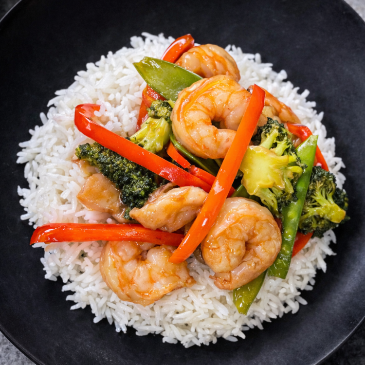 Broccoli is the star, but snow peas, bell peppers, and mushrooms add color, texture, and flavor. This combination creates a balanced shrimp stir-fry with rice that feels like takeout at home.