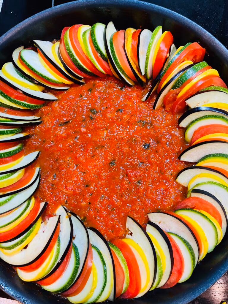 If you’re wondering how to make ratatouille ahead of time, this recipe is very forgiving. You can roast the sauce and slice the vegetables up to one day in advance, then assemble and bake when ready. Freezing is not recommended for traditional ratatouille, as zucchini and eggplant release water when thawed, changing the texture.