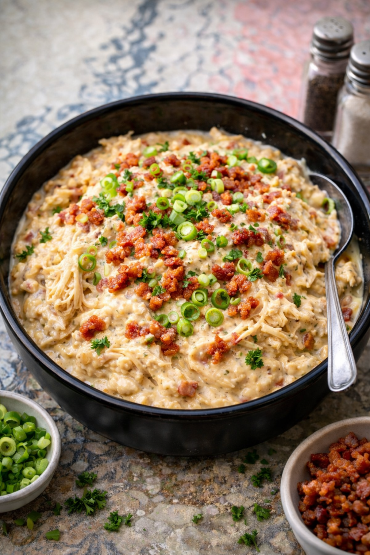 What really makes this version special is the texture and how it’s meant to be served. The chicken is properly shredded, not chunky, so every bite is creamy and cohesive. And instead of treating it like a dip, this recipe is built to be a real meal — spooned over baked potatoes, rice, or even tucked into a roll.